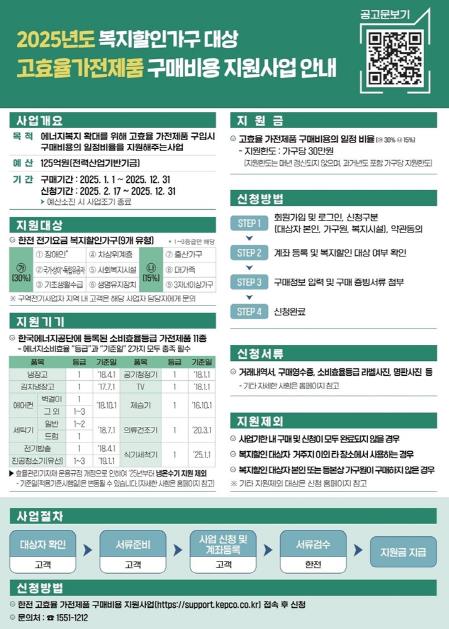 신청은 한국전력공사 고효율 가전제품 구매비용 지원사업 누리집에서 가능하며, 자세한 사항은 전담 콜센터로 문의하면 안내받을 수 있다.