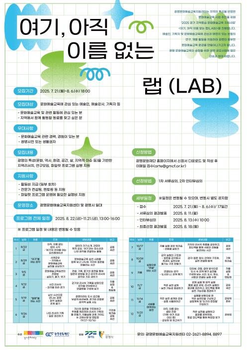 ‘여기, 아직 이름 없는 랩(LAB)’은 8월 22일부터 11월 21일까지 매주 금요일, 광명문화예술교육지원센터 및 광명시 전역을 중심으로 운영되며, 지역 리서치와 연구모임을 통해 광명의 특성을 반영한 시범 프로그램을 개발하고 실행하는 과정을 포함한다.