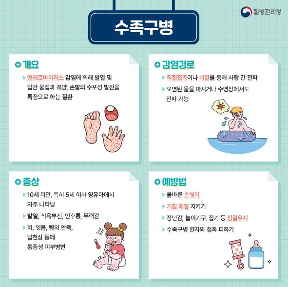 수족구병은 장바이러스(엔터로바이러스)로 인해 발생하는 급성바이러스성 질환으로 환자의 대변 또는 분비물(침, 가래, 콧물, 수포의 진물 등)과 직접 접촉하거나, 이러한 것에 오염된 물건 등을 만지는 경우 전파될 수 있다. 주요 증상으로 손, 발, 입안에 수포성 발진이 나타나며, 발열, 무력감, 식욕 감소, 위장관증상(설사, 구토)이 나타날 수 있다.