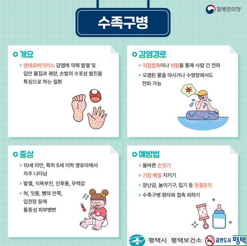 평택시 보건소 관계자는 “수족구병은 예방백신이 없으므로 올바른 손 씻기 등 예방수칙 준수가 가장 중요하며, 특히 영유아 보육시설에서는 위생 관리를 철저히 하고, 수족구병에 걸린 영유아는 완전히 회복한 후 등원할 수 있도록 안내할 것”을 당부했다.
