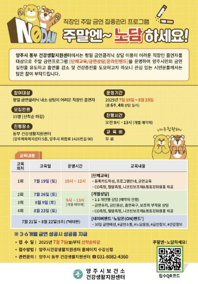 양주시보건소 관계자는 "이번 주말 금연 프로그램을 통해 바쁜 직장인들도 금연에 성공할 수 있도록 적극 지원하겠다"며 "앞으로도 시민들이 담배 연기 없는 건강한 환경에서 생활할 수 있게 다양한 금연 지원 정책을 추진해 나가겠다"고 말했다.
