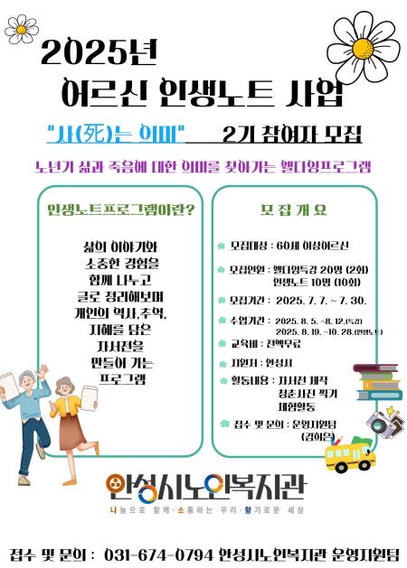 이번 사업은 어르신들이 자신의 삶을 돌아보고 미래를 준비할 수 있도록 돕는 웰다잉(well-dying) 문화 조성의 일환으로 추진된다. 웰다잉 특강 참여자 중 10명의 어르신을 대상으로 오는 8월부터 10월까지 ‘인생노트’ 2기 활동을 운영할 예정이다.