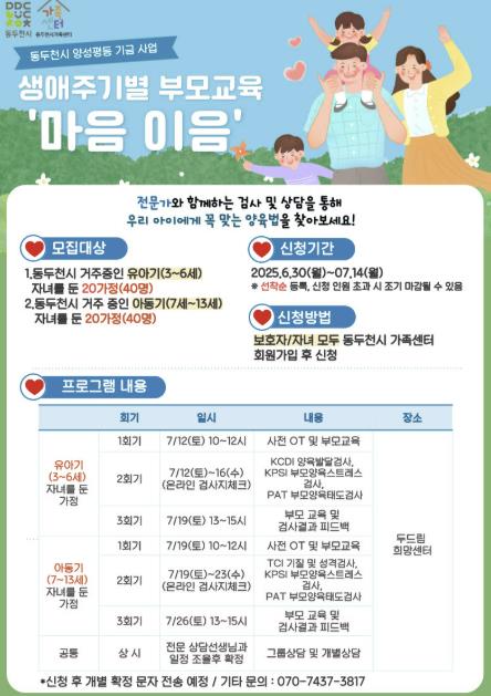 ‘마음이음’은 2025년 동두천시 사회복지기금 공모사업으로, 부모가 자녀를 더 깊이 이해하고, 양육 과정에서 겪는 스트레스와 어려움을 해소할 수 있도록 돕기 위해 기획됐다. 특히 부모 역할의 균형과 공동 양육에 대한 인식을 제고하고, 양육에 대한 자신감과 책임감을 함께 키울 수 있도록 지원한다.