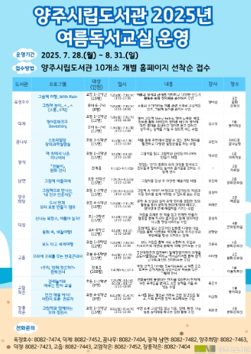 이번 여름독서교실은 7월 28일부터 8월 31일까지 양주시도서관 10개소에서 총 17개 강좌 및 전시로 진행된다.