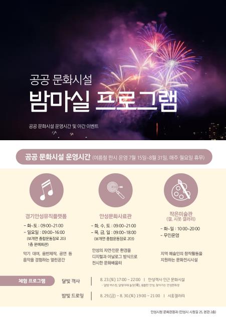 안성 공공문화시설도 이와 함께 야간 문화 활성화를 위한 특별 프로그램도 마련했다. 오는 8월 23일에는 ‘달빛 객사’가 열려, 안성객사와 인근 문화시설에서 다양한 야간 공연과 체험이 진행될 예정이며, 8월 29일~30일에는 공도 중앙어린이공원과 시옷갤러리에서는 야광 드로잉 체험과 버스킹 공연이 어우러진 ‘밤빛 드로잉: 우리가 함께 그리는 밤’이 펼쳐져 시민들에게 감각적인 여름밤의 경험을 선사한다.