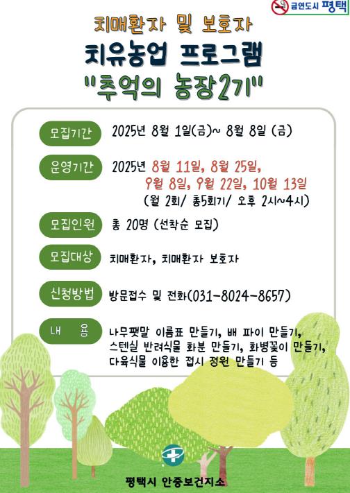 현재 치매 진단을 받은 어르신과 그 보호자를 대상으로 참여자를 모집 중이며, 선착순 20명을 접수할 예정이다. 참여를 희망하는 대상자는 안중보건지소 만성질환팀으로 전화 또는 방문해 신청할 수 있다.