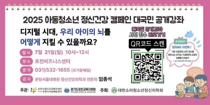 이번 강좌는 대한소아청소년정신의학회가 주최하고, 포천시정신건강복지센터와 경기도포천교육지원청이 공동 주관한다. 주제는 ‘디지털 시대, 우리 아이의 뇌를 어떻게 지킬 수 있을까요?’로, 임종석 분당서울대학교병원 정신건강의학과 전문의가 강연자로 나선다.