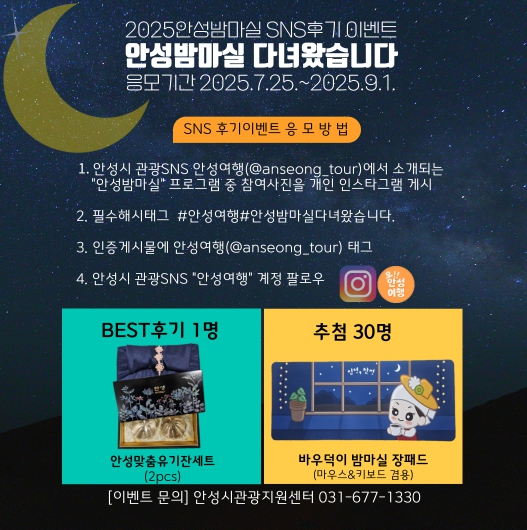 이번 이벤트는 올여름, 안성의 야간관광 프로그램인 ‘안성밤마실’에 참여 후 체험 사진과 후기를 개인 SNS에 공유하는 방식으로 진행된다. 이를 통해 안성의 야간 관광지와 다양한 체험 콘텐츠의 매력을 자연스럽게 홍보하고, 8월까지 진행되는 밤마실 프로그램뿐만 아니라 지역 야간관광에 대한 관심과 참여를 유도할 계획이다.