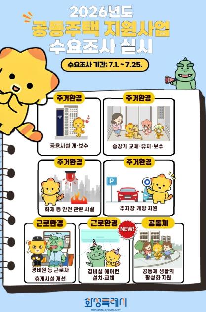 이번 수요조사는 공동주택 지원사업 수요를 사전에 파악해 내년도 사업계획 수립 및 예산편성에 반영하기 위한 것으로, 매년 초 공모방식으로 추진되는 공동주택 지원사업의 사전 절차다.