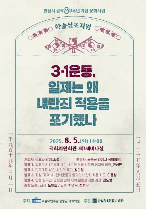 특히 이번 심포지엄은 일제가 3·1운동과 관련된 수많은 재판 중 일부 사건에 대해 내란죄 적용을 검토했으나, 이를 최종적으로 적용하지 않은 배경과 법적·정치적 의미를 심층적으로 다룬다.
