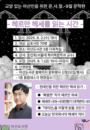 프로그램은 김포시민 70명을 대상으로, 9월 3일 19시부터 마산도서관 3층 다목적실에서 진행된다. 참여자 모집은 8월 1일 오전 10시부터 마산도서관 홈페이지를 통한 온라인 신청과 통합데스크에서의 현장 신청으로 진행한다.
