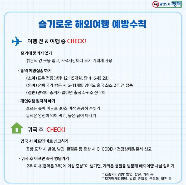 평택보건소 관계자는 “해외 유입 감염병은 개인의 예방수칙 준수 여부가 지역사회 전파를 막는 핵심”이라며 “출국 전 예방접종 확인과 귀국 후 신속한 신고를 반드시 실천해 달라”고 강조했다.