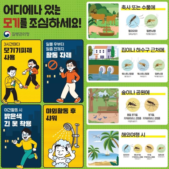 수인성‧식품매개감염병 예방을 위해서는 조리 전후 30초 이상 비누로 손을 씻고, 안전한 물(생수 또는 끓인 물)과 충분히 익힌 음식을 섭취해야 한다. 모기매개감염병은 고인 물 제거, 야간 외출 자제(오후 10시~새벽 4시), 방충망 점검, 기피제 사용 등을 통해 예방할 수 있다.