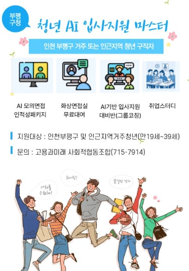 대상은 인천 지역 청년(만 19~39세, 부평 거주자 우선 선발) 거주자 또는 부평구 소재 기업에 취업을 희망하는 청년이다. 모집 인원은 인공지능 입사지원 프로그램 100명과 입사지원 대비반 20명 등이다.