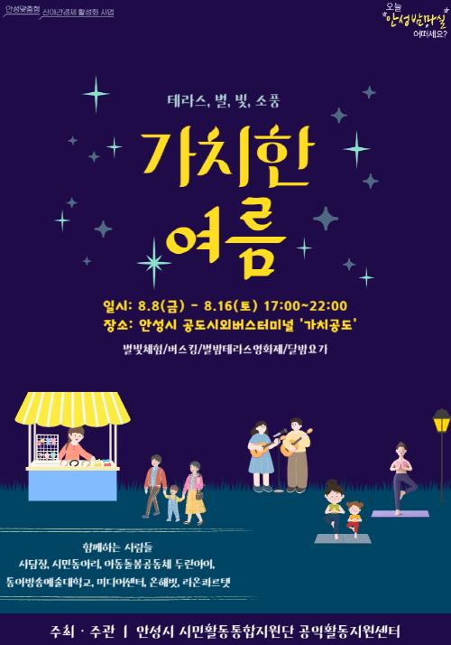 이번 행사는 안성시가 추진중인 신 야간경제 활성화 사업의 일환으로 시민활동통합지원단에서 여름철 야간 시간대 시민 공유공간을 활용하여 시민들에게 다양한 문화, 체험 프로그램을 선보이고자 추진한 것이다.