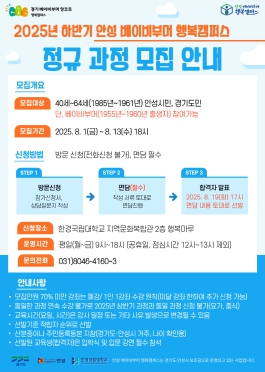 모집 기간은 8월 1일부터 8월 13일까지이며, 방문 접수로 진행된다. 수강료는 전액 무료이며, 자세한 사항은 안성 베이비부머 행복캠퍼스 사무실로 문의하면 된다.