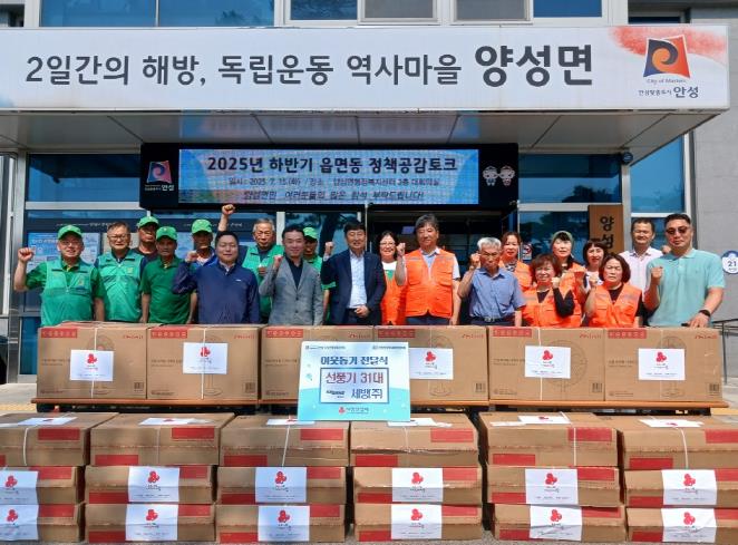 이번에 기탁된 물품은 양성면 소재 31개 경로당에 각 1대씩 전달되어 폭염이 계속되는 여름철에 경로당이 무더위쉼터의 기능이 충분히 발휘될 수 있게 됐다.