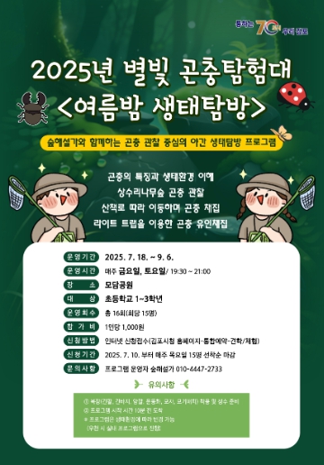 이번 ‘별빛 곤충탐험대-여름밤 생태탐방’ 프로그램은 산지형 공원의 생태자원을 활용한 체험형 프로그램으로, 7월 18일부터 9월 7일까지 매주 금요일, 토요일 오후 7시 30분부터 9시까지 모담공원 유아숲체험장에서 진행된다.