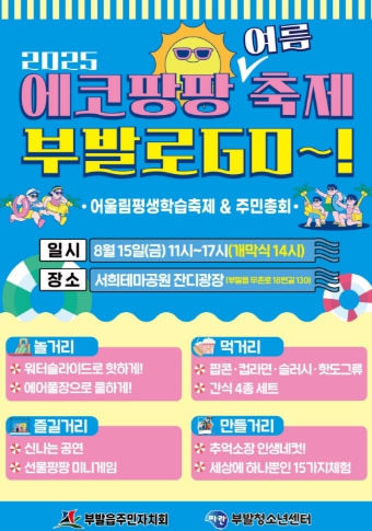 작년에 이어 두 번째로 개최되는 축제는 2024년 주민총회에서 선정된 부발 어울림 계절축제의 일환으로 어린이·청소년과 더불어 가족이 함께 신나게 물놀이를 즐길 수 있는 축제의 장이 마련된다. 대형·중형 워터 슬라이드 운영 뿐만 아니라 유아풀을 별도로 마련하여 안전하게 물놀이를 즐길 수 있도록 만반의 준비를 다했다. 함께 축제를 준비하는 부발청소년센터 청소년들이 다양한 체험과 공연, 아이디어 반짝이는 이벤트들을 직접 기획·운영 예정에 있어 주민자치회와 청소년들이 스스로 기획하고 만들어 가는 축제라는 점에서 더욱 의미가 크다.