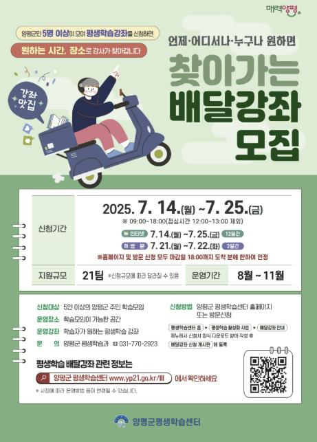 신청 자격은 5인 이상의 양평군민으로 구성된 학습모임이며, 신청은 양평군 평생학습센터 누리집 공지사항에서 등록된 배달강좌 신청서를 내려받은 후, 신청 게시판에 등록하거나 평생학습센터를 직접 방문해 제출하면 된다.