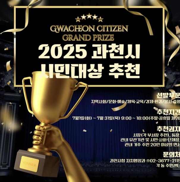과선시 관계자는 “시민대상은 살기 좋은 과천을 만드는 원동력인 시민들의 헌신을 널리 알리는 자리”라며 “많은 시민들의 적극적인 관심과 참여를 바란다”라고 말했다.