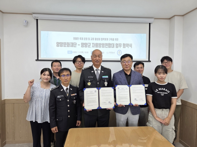 이날 양양문화재단에서 협약식이 열린 가운데, 양양문화재단과 양양군 자율방범연합대는 양양군민의 안전하고 쾌적한 문화 환경 조성을 위해 다양한 협력 사업을 추진하고 지역문화에 기여할 것으로 다짐했다.