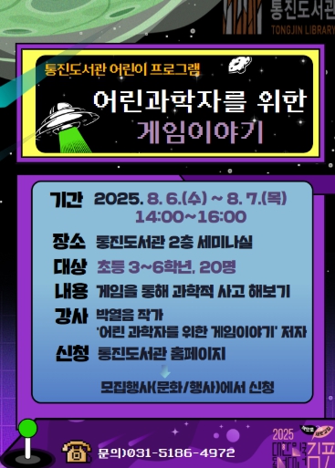 2025년 공공도서관 독서프로그램 운영지원 사업의 일환으로 운영되는 이번 프로그램은 과학과 인문학의 융합 교육을 목표로 어린이들이 일상에서 친숙하게 접하는 ‘게임’을 통해 과학적 사고와 인문학적 탐구심을 키우는 수업이다.