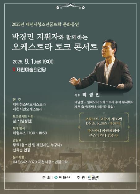 이번 토크콘서트는 박 지휘자의 해설과 지휘 아래, 제천청소년오케스트라와 제천시민오케스트라가 함께 참여하는 합동 무대로 펼쳐진다.