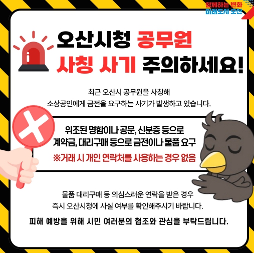 시 관계자는 “공공기관이나 공무원이 소상공인을 대상으로 계약금 송금이나 대리구매를 요청하는 경우는 절대 없다”며, “의심스러운 연락을 받으면 즉시 오산시청에 사실 여부를 확인하고, 사기 피해 예방에 적극 동참해 달라”고 강조했다.