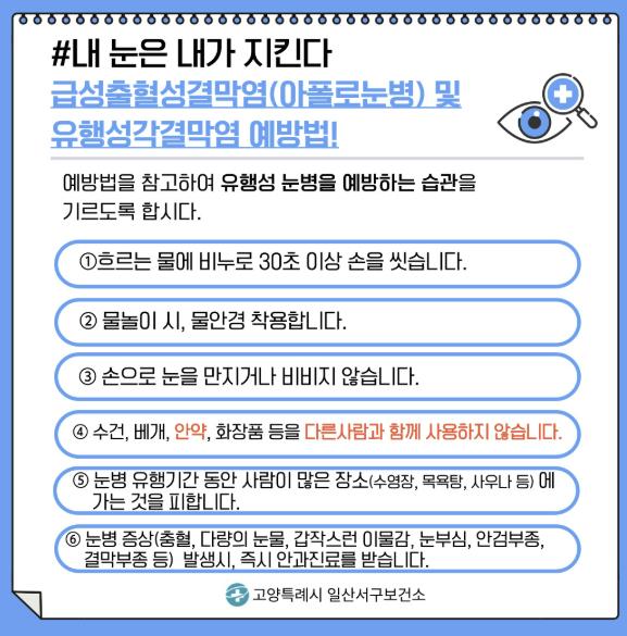 일산서구보건소 관계자는 “아폴로눈병은 전염력이 강하고 빠르게 퍼지기 쉬운 질환인 만큼, 손 위생과 개인 물품 관리만 철저히 해도 충분히 예방이 가능하다”며 “특히 감염 의심 시에는 출근·등교를 자제하고, 가족 간 전파도 막을 수 있도록 주의해달라”고 전했다.