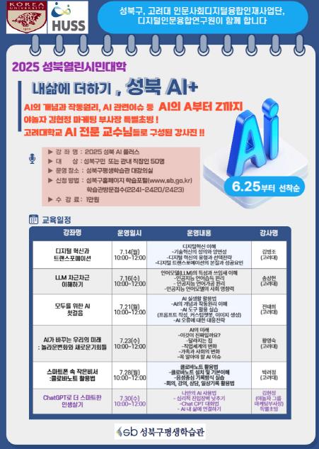 성북구는 이달 14일부터 30일까지 고려대학교 디지털인문융합연구원과 공동으로 기획한 ‘성북 AI+’ 특강을 운영한다. 구민 학습수요 설문결과를 적극 반영해 마련된 이번 특강은 인공지능(AI)에 대한 이론과 실제 활용 역량을 동시에 강화할 수 있는 시민 교양 강좌로, 최신 AI 이슈와 실생활 적용 방안을 폭넓게 다룬다.