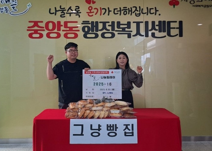 백경희 중앙동장은 “지역 내 어려운 이웃을 위해 기꺼이 빵을 후원해주신 ‘그냥, 빵집’에 진심으로 감사드린다”며, “후원받은 빵은 이웃들에게 정성과 함께 소중히 전달하겠으며, 앞으로도 지속적인 나눔 활동을 통해 지역사회의 온정을 확산해 나가겠다”고 밝혔다.