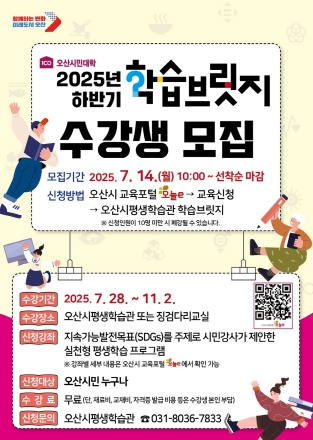 강좌는 오산시 평생학습관 및 징검다리교실(관내 공유학습공간 20개소)에서 진행되며, 수강 신청은 오산시 교육포털 ‘오늘e’를 통해 온라인으로 진행된다. 강좌별 세부 내용과 일정은 포털에서 확인할 수 있으며, 일부 강좌는 조기 마감될 수 있다.