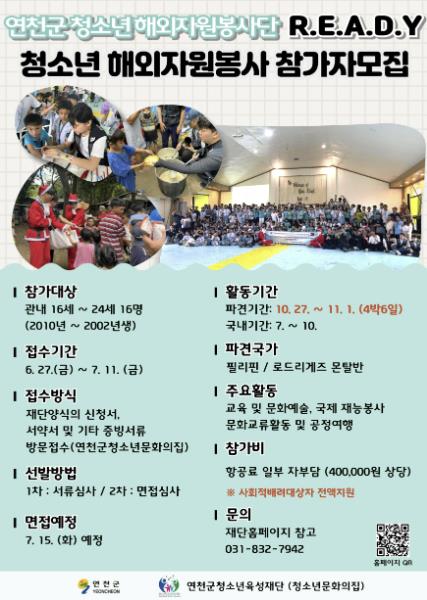 2023년 첫 파견활동을 시작으로 금년 3회차로 진행되는 해외자원봉사는 연천군 관내 청소년중 16세~24세(2010년 ~ 20002생) 16명을 선발하여 약 3개월 간 국내활동을 통해 다양한 봉사 프로그램을 준비하여 2025년 10월 27일 ~ 11월 1일(5박 6일간) 필리핀 로드리게즈 몬탈반(Rodriguez, Montalban)의 지역학교 및 빈민 지역에 청소년 해외자원봉사단을 파견할 예정이라고 밝혔다.