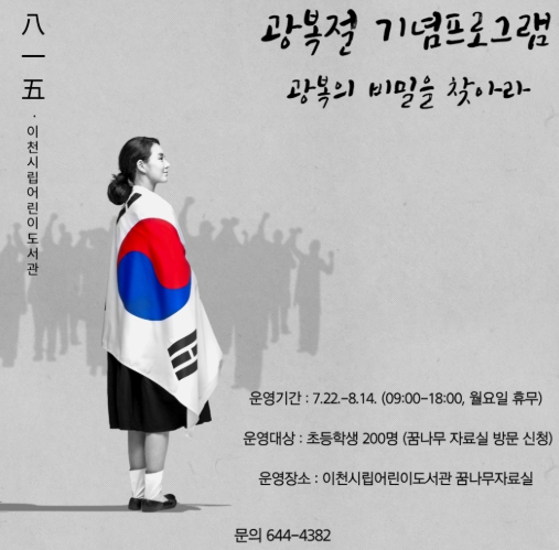 이번 프로그램은 이천시 어린이들에게 광복절의 역사적 의미를 자연스럽게 전달하고, 도서관과의 친밀감을 높이기 위해 기획됐다. 참여를 희망하는 어린이는 어린이도서관 2층 꿈나무자료실에서 현장 접수를 통해 미션지를 수령하면 된다.
