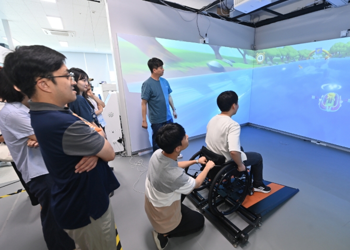 특히 벽면 디스플레이 영상 속 자신의 아바타를 휠체어 트레드밀 센서로 조정해 실제처럼 경주를 펼치는 ‘휠체어 레이싱’ 체험에서는 참가자들의 반응이 뜨거웠다. 순발력과 근력, 지구력을 요하는 이 콘텐츠는 듀얼센서가 탑재된 특수 트레드밀 위에서 실시간으로 다른 참가자들과 경쟁하며 게이미피케이션을 경험할 수 있도록 설계돼 있다.