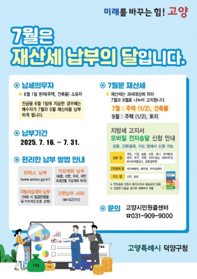 재산세 납부 기한은 7월 16일부터 31일까지이며, 금융기관의 ATM 기기, 위택스, 전용 가상계좌, 지방세입계좌 또는 ARS 간편납부(☎142211) 등 다양한 방법으로 전국 어디서나 편리하게 납부할 수 있다.