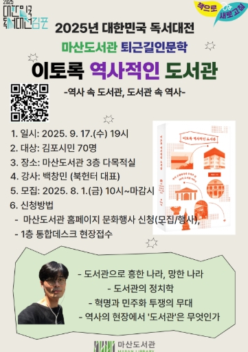 이번 프로그램은 『이토록 역사적인 도서관』의 저자이자 ‘북헌터’의 대표 백창민 작가를 초청하여 진행되는 퇴근길 인문학 강의로 야간시간대(19시)에 진행된다. 전국의 많은 도서관에서 도서관의 역사에 대해 강의를 진행한 작가가 이번에는 마산도서관에서 ‘역사 속 도서관, 도서관 속 역사’라는 주제로 강의한다. 역사의 흐름과 더불어 다양한 역사적인 사건 속에서 도서관의 역할과 변천사 및 도서관이 지니는 의미와 가치에 대해 알아볼 예정이다.