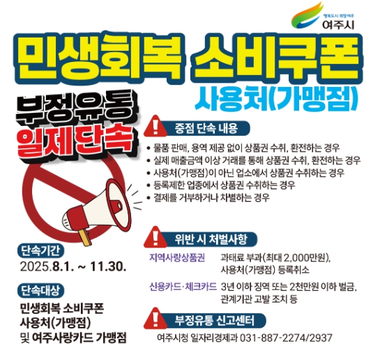 여주시 일자리경제과 관계자는 “민생회복 소비쿠폰 및 지역화폐 발행 취지에맞게 사용될 수 있도록 사용자와 사용처(가맹점)주 모두 함께 힘을 합쳐야 건전한 유통 문화를 만들어갈 수 있다”라며 협조를 당부했다.