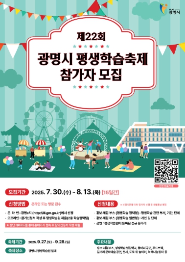 올해 축제는 오는 9월 27일부터 28일까지 광명시 평생학습원 일대에서 열릴 예정이며, 시민이 주도하는 대표적인 평생학습 축제로서 다양한 배움과 체험의 장을 마련한다.