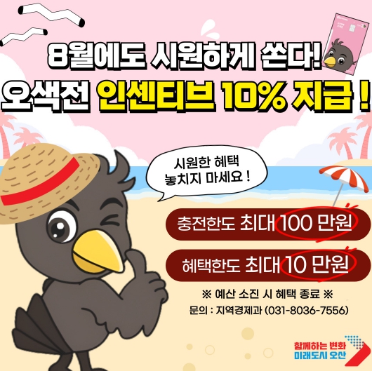 이번 조치는 지난 7월 시행된 인센티브 혜택에 대한 시민들의 높은 호응과 현장 반응을 반영해 결정됐다. 8월 한 달간 오색전을 충전하면 충전금액의 10%가 추가로 적립된다. 월 최대 100만 원 충전 시 10만 원까지 혜택을 받을 수 있다. 단, 예산이 소진될 경우 조기 종료될 수 있어 사전 확인이 필요하다.