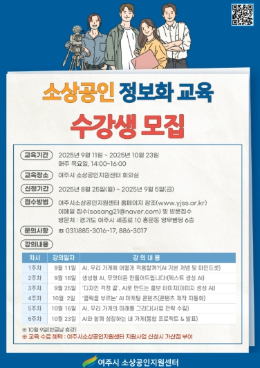 교육기간은 9월 11일부터 10월 23일까지, 매주 목요일 오후 2시부터 4시까지총 6회에 걸쳐 운영된다. 신청 방법은 여주시소상공인지원센터의 모집 공고를 확인한 뒤, 관련 신청서를 이메일 또는 방문을 통해 제출하면 된다.