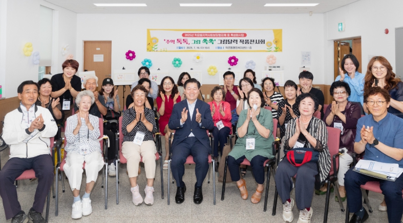이번 전시회는 6월 11일부터 진행한 문화예술 주민 참여 복지프로그램의 마무리 행사로, 학온동 어르신 10명과 지역사회보장협의체 위원 2명이 함께 만든 작품 12점을 전시하고 그림 달력을 제작해 선보였다.