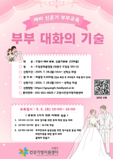 참여 대상은 예비부부 및 신혼부부(결혼 3년 이내) 15커플로, 참여 신청은 7월 28일부터 고양시 건강가정지원센터 누리집에서 가능하며, 커플당 5천원의 참가비가 있다.