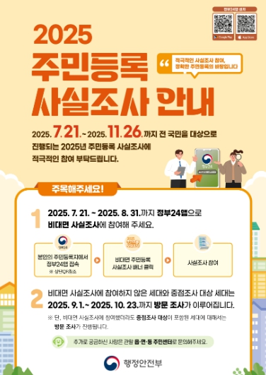 방문 조사 대상은 비대면-디지털 조사 미참여 세대와 중점 조사 대상 세대로, 중점 조사 대상 세대는 △100세 이상 고령자 △5년 이상 장기 거주불명자 △복지 취약계층(보건복지부의 복지위기가구 발굴 대상자 중 고위험군) △사망 의심자 △장기 미인정 결석 및 학령기 미취학 아동 포함 세대이다. 비대면 사실조사에 참여했더라도, 중점 조사 대상자가 포함된 세대는 방문 조사가 추가로 이루어진다.