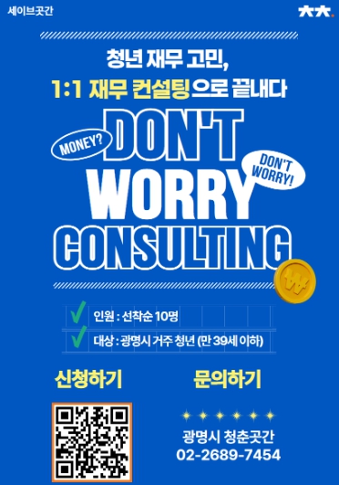 ‘돈워리 컨설팅’은 18세부터 39세 이하의 광명시 거주 또는 활동 청년을 대상으로, 개인 맞춤형 재무 상담을 제공해 경제적 자립과 건전한 금융 습관 형성을 지원한다.