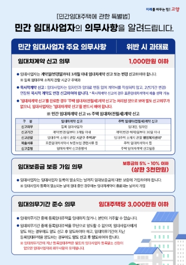 안내문에는 등록 임대사업자의 주요 의무사항인 ▲임대차계약신고 의무 ▲임대보증금 보증 가입 의무 ▲임대의무기간 준수 의무 ▲임대료 증액 제한 의무 등에 대한 설명과 위반 시 과태료 부과에 대한 내용이 담겨있다.