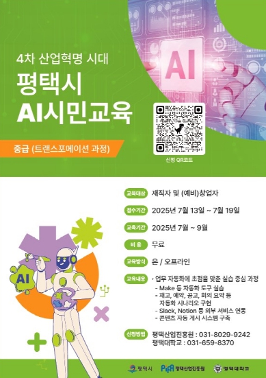 정장선 평택시장은 “AI가 선택이 아닌 생존전략이 된 시대에, 평택시는 산업 현장에 즉시 투입이 가능한 AI 실무 인재를 적극 양성해 관내 기업의 혁신과 미래 산업의 중심도시로 도약할 수 있도록 노력하겠다”라며, “제조기업의 혁신과 첨단산업 발전을 견인할 핵심 인재들의 많은 참여를 바란다”라고 밝혔다.