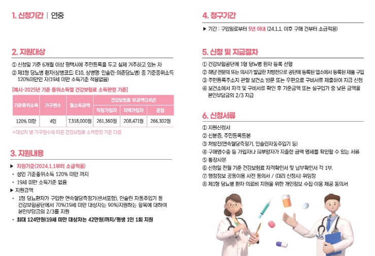 신청 기간은 연중(예산소진 시까지)으로 2024년 1월 이후 구매 건부터 신청이 가능하며 신청 서류는 △신청서 △신분증 △주민등록등본 △처방전(연속혈당측정기(센서 포함), 인슐린자동주입기) △구매영수증 등 지출한 금액 명세를 확인할 수 있는 서류 △통장 사본 △신청일 기준 전월 건강보험료 자격확인서 및 납부확인서 각 1부 △개인정보 수집·이용 제공 동의서 등이며 관할 보건소에 신청하면 된다.
