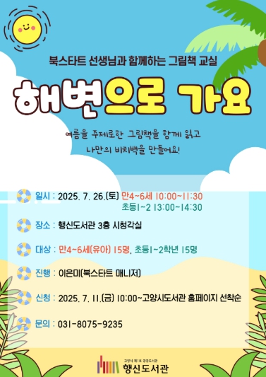 이 프로그램은 행신도서관 북스타트 매니저가 진행하며, 아이들과 여름을 주제로 한 그림책 함께 읽기, 부채 만들기, 비치백에 그림 그리기 등 창의성을 키우는 체험 활동이 진행된다.